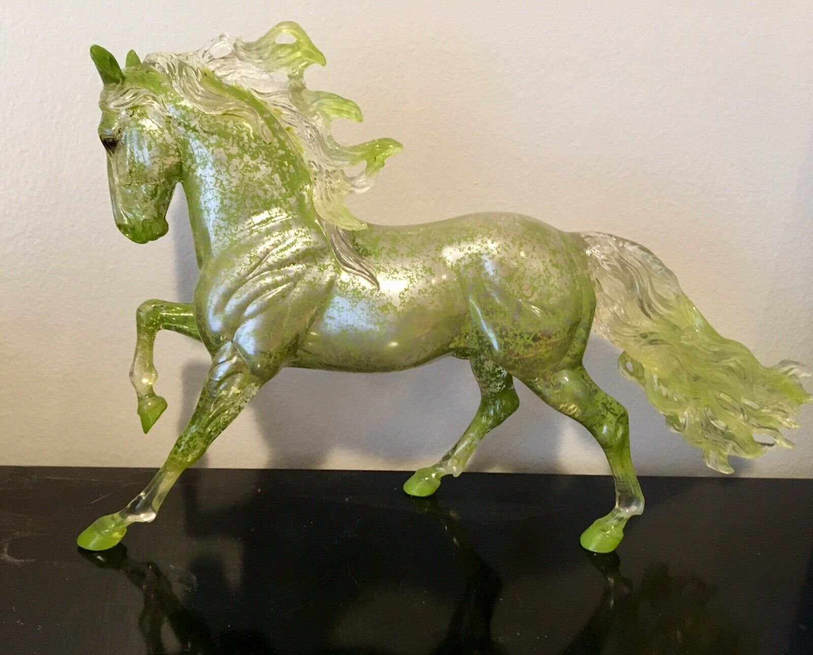 Glossy translucent with green resist spotting, green hooves, silver undertones, stamped “BreyerFest 2019 30th Anniversary”, BreyerFest SR, 1/400