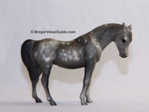 The first 1975 Breyer-released Arabian Mares were the regular runs: dapple grey (#5011,) bay (#5014) and alabaster (#5017.) In 1994, a second dapple grey release was made for the #5650 Saddle Club Collection. The easiest way to tell these two releases apart are by the dapples. The original #5011 had “wild” dappling with spots, streaks, and splotches. The later release features dapples that were more uniform and rounded, giving her a polka-dot like appearance.