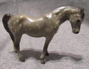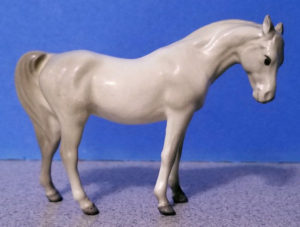 The Arabian Mare was sculpted by Maureen Love Calvert and originally produced in ceramic by the Hagen Renaker Company. The Hagen Renaker pieces are more difficult to find on the secondary market than their plastic Breyer cousins, and therefore generally command higher prices.