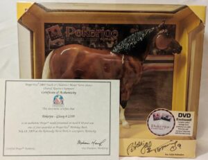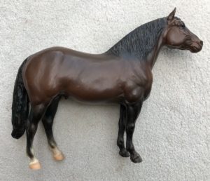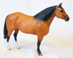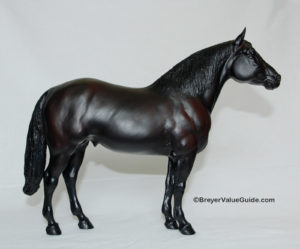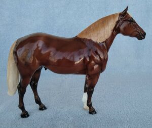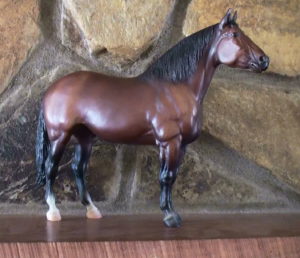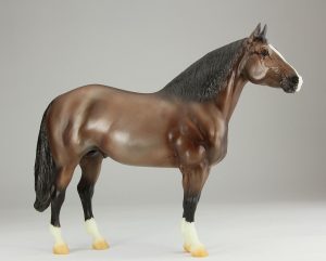Metallic brown bay, blaze, 4 socks, one of a kind test run offered to Collector Club members by lottery.