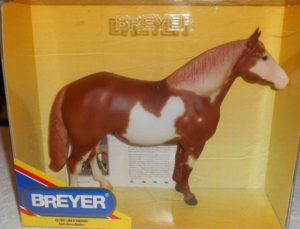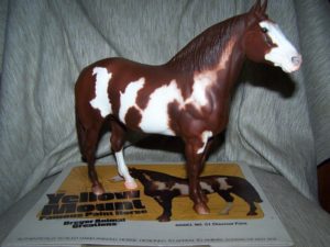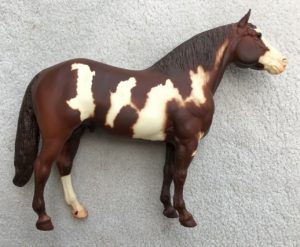 Glossy sorrel pinto; stenciled bald face; 2 high hind socks; BreyerFest Live Show Prize SR Youth Grand Champion, 1/4