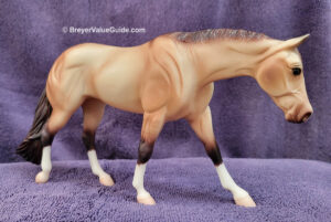Matte buckskin; dark points; blaze; dorsal stripe; 4 socks; Walmart SR - With American Quarter Horse Foal; American Quarter Horse Stallion