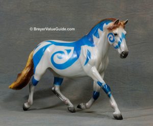 Semigloss mulberry grey and soft pearl; fiery ginger mane and tail, blue war paint; BreyerFest SR