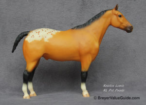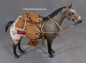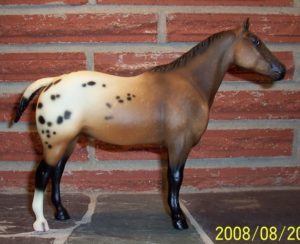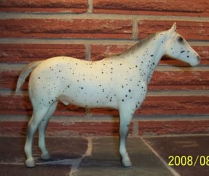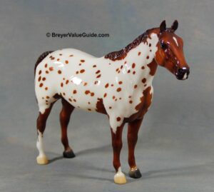 Matte sorrel blanket appaloosa with splatter spots; flaxen mane and tail; solid face - with tack and Brenda Breyer doll