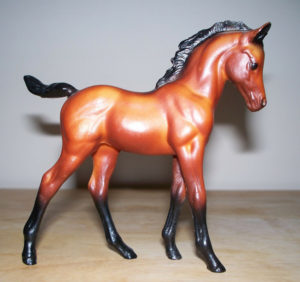 Matte chestnut; bald face; 4 stockings; grey hooves, sold in blister packs