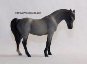 Matte steel grey; darker mane and tail; solid face; matte eyes; 4 vague socks; dark grey hooves; Sears SR 1/4500