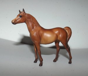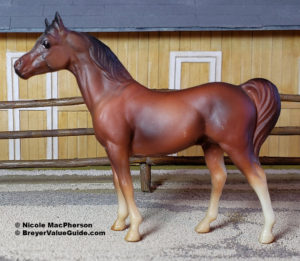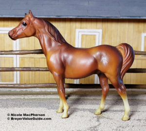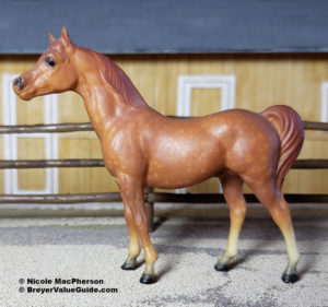 Matte light chestnut; lighter on belly and legs; black mane and tail; JCPenney SR
