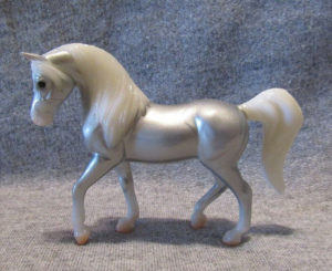 Glossy silver; white mane and tail; bald face; tan hooves; BreyerFest SR