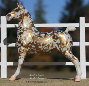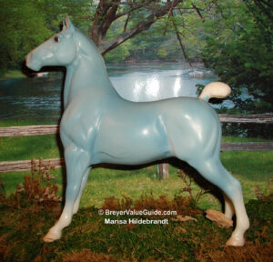 Matte wedgewood blue; bald face; gold bands in mane; 4 socks; BreyerFest Raffle SR; 1/26