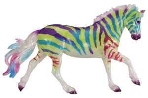 Glossy neon rainbow zebra, chartreuse base with purple, blue and pink stripes, BreyerFest SR, 1/2200