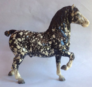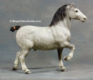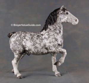 Glossy smoke grey with black splash appaloosa spots; bald face; white mane and tail; 4 stockings; gold sticker; Vintage Club SR; 1/500