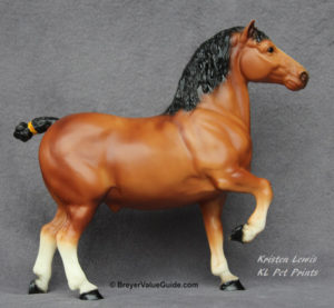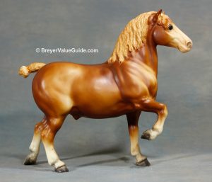 Matte chestnut/sorrel; flaxen mane and tail; bald face; 4 stockings; red crisscrosses on yellow tail ribbon; mail order companies SR; 1/244