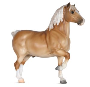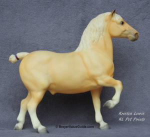 Matte cream or light palomino; blaze; 4 stockings; grey hooves; eye-whites; numbered; blue on red ribbon; Commemorative Edition; 1/10,000