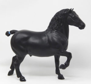 Semigloss black; blue ribbon with white crisscrosses; some have glossy hooves; made for Disney World Orlando