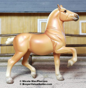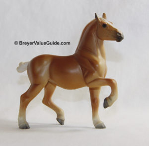 Matte sorrel/palomino; blaze; lighter legs; grey hooves; unpainted tail ribbon
