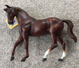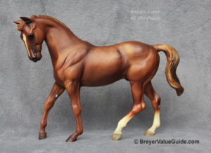 Semigloss red bay; star; 2 low socks; eye-whites; gold signature on belly; with doll and halter; 1/250 made for equine charities