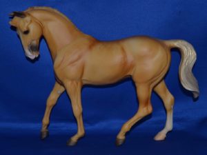 Glossy olive grullo; blaze; 2 socks; painted shoes; JAH SR; 1/3000 - with matching Warmblood Stablemate