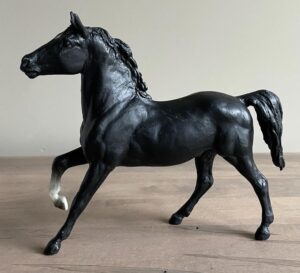 Glossy black; diamond star; 1 front sock; includes doll; halter and lead; "Black Beauty" paperback book