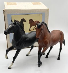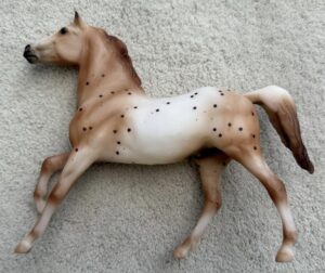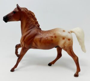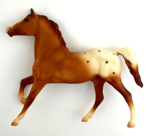 Matte chestnut blanket appaloosa; wide blaze; 4 socks; bi-color tail; JCPenney SR - with Andalusian Foal, Mustang Foal