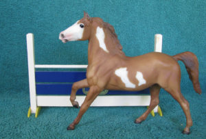 Matte chestnut pinto; stenciled bald face; solid legs; black spots on muzzle; includes blue and white plank jump