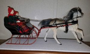 Flocked dappled grey; set includes harness; black and red wooden sleigh; 2 porcelain dolls; wood base and plastic cover; JCPenney SR; 1/1500 Valued as complete set.
