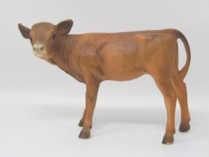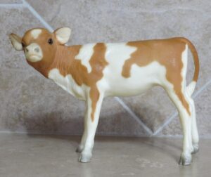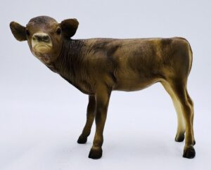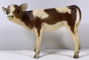 Cow - Matte brown and white, white face with brown eye patch, white belly and legs, grey shaded horns, collar with bell