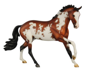 Matte chestnut pinto; lighter mane and tail with shading; mapped markings; wide blaze; pink muzzle; 3 socks; painted horseshoes; Premier Club SR