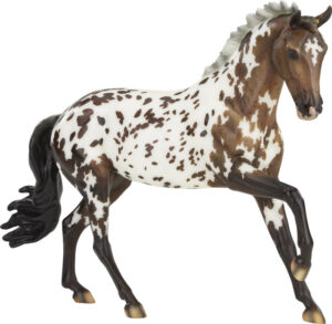 Glossy dark chestnut leopard appaloosa, large star, dark legs and tail, white and grey shaded mane, striped hooves, BreyerFest Prize SR, 1/30