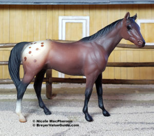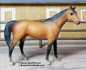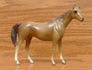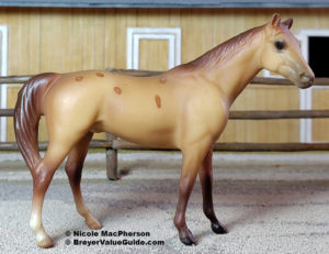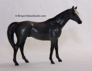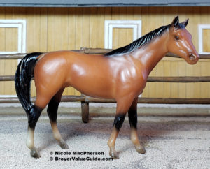 Matte light bay; 2 hind socks; early models had black legs; later model were browner with no black