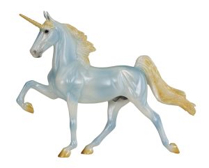 Metallic shaded pastel blue, gold horn and hooves, gold shaded mane and tail with glitter