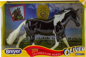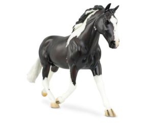 Glossy black pinto, blaze, 4 white stockings, white tail, stamped "BreyerFest 2019 30th Anniversary", BreyerFest Prize Model SR, 1/39