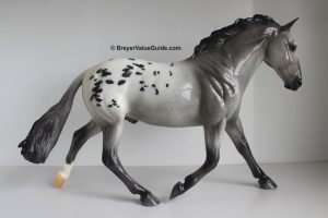 Matte varnish blue roan blanket appaloosa, roaning with dark points, stenciled black spots, bald face, 1 hind sock, braided mane, BreyerFest SR, 1/375 matte