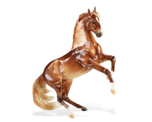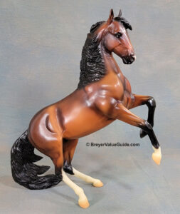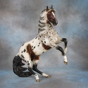 Matte bay semi-leopard appaloosa; extensive roaning; peacock spots; bi-color mane and tail; large star; 4 socks; 4 striped hooves; BreyerFest Raffle SR; 1/26