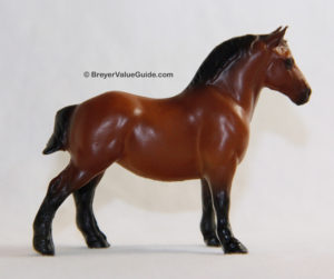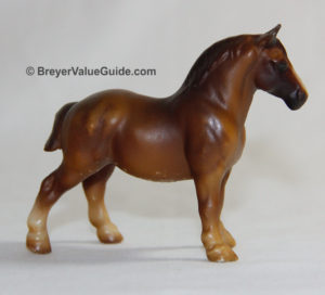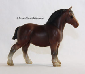 Matte dark chestnut; darker mane and tail; bald face, various socks; grey hooves; Riegseckers SR; 1/200