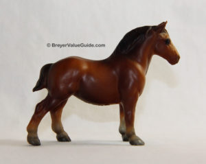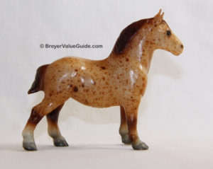 Matte shaded chestnut/brown; blaze; darker head, mane and tail; various socks/lighter legs; resist dapples/roaning on belly; JCPenney SR