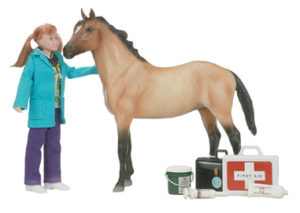 Matte buckskin; darker face; star; dark points; 2 hind socks - with doll and accessories