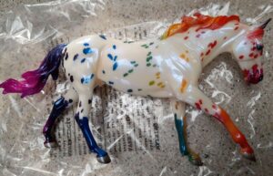 Glossy leopard appaloosa, rainbow spots, rainbow mane and tail, and legs, with blue interference, BreyerFest SR, 1/325 glossy