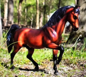 Matte chestnut/sorrel; flaxen mane and tail; blaze; 4 socks; grey hooves; JCPenney SR - with Family Arabian Mare and Family Arabian Foal