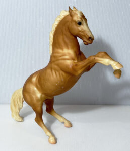 Glossy palomino; white mane and tail; bald face; 4 stockings; foam pads on bottom of hind hooves and tail