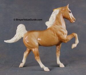 Glossy palomino; bald face; 4 stockings; yellow ribbons with red crisscrosses; pinked hooves
