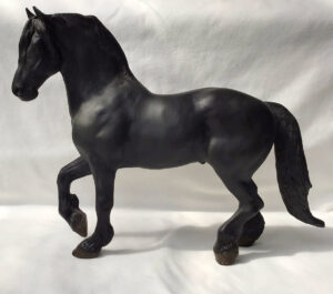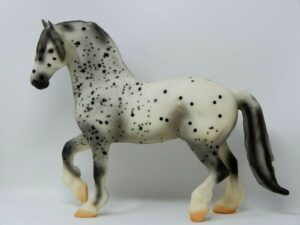 Matte black leopard appaloosa; white with black splash spots and grey shading; striped mane and tail; tan hooves; JCPenney SR - with Running Foal and Dalmation
