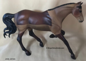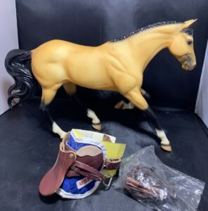 Matte buckskin; star and snip; 4 socks; red, white and blue braids; hand numbered on belly; with saddle and bridle; 1/5000