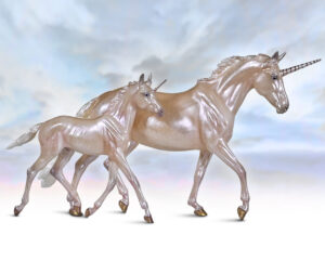 Pearly cremello; dapples; blue eyes; golden hooves; gold striped horn; Web SR - with Giselle
