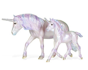 Iridescent white with light pink and blue shading; added horn; includes pink blanket; website exclusive - with Haflinger Mare