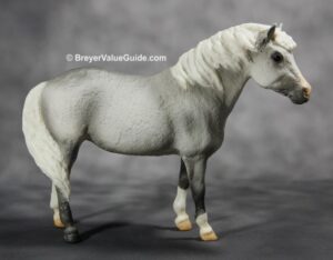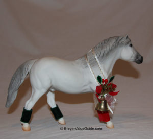 Matte shaded grey; white snip; pink shaded muzzle; white mane and tail; 3 socks; includes holiday sleigh; Holiday SR