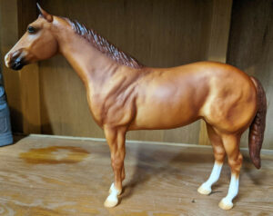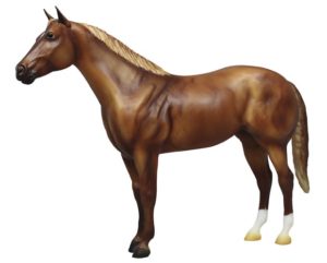 Matte chestnut; blaze; 3 socks; striped hooves; QH Outfitters SR