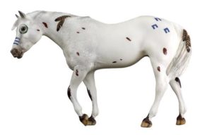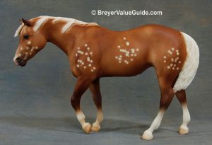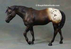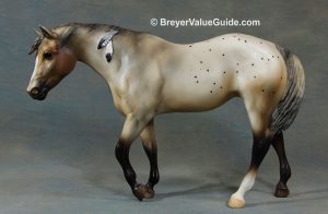 Matte few spot appaloosa, base-coat chalky white, resist dapples, brown spots, green eye circle, brown feathers in mane and tail, BreyerFest Prize SR, 1/10