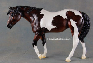 Glossy dark bay pinto; white base coat; small star; snip; 4 stockings; BreyerFest Volunteer SR; 1/100