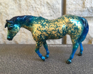 Semigloss woodgrain with blue and white feathers added to mane, stripe, 4 socks,