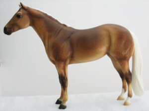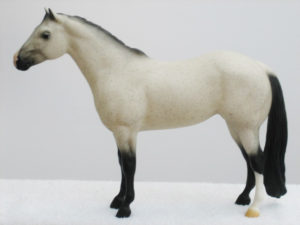 Matte buckskin; bald face with pink nose; black points; "B" stamp on inside back leg; Model Horse Congress SR; 1/244